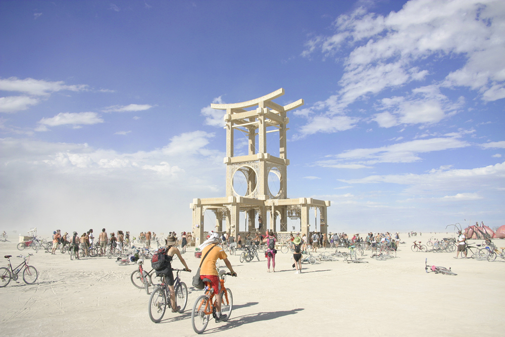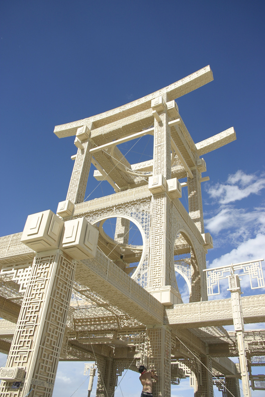 Here is an image of Burningman 2007, showing the Temple of Forgiveness. It was of course burned on the last day of the festival. The amazing thing about this structure was how it revealed itself upon approach. From far away, it looks very plain. As you get closer, the patterns and embossing becomes visible, like a cell under a microscope. At a very close up view, you can see the writing on the walls.